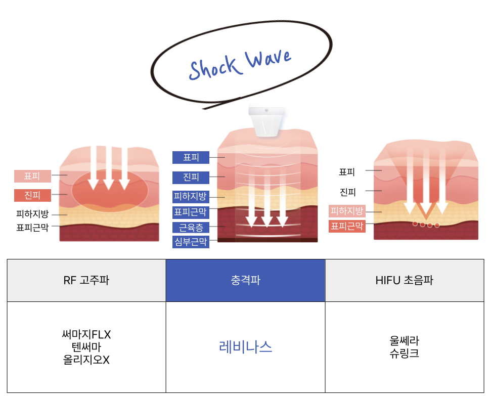 기존 레이저들과 비교해서 말씀드리는게 더 쉬울 것 같습니다. 고주파(써마지, 텐써마, 올리지오) 의 경우 표피와 진피에 주로 작용하여 피부 표면의 탄력개선을 유도하고, 초음파 원리(울세라, 슈링크)의 레이저는 깊은 진피층부터 지방층에 도달하여 리프팅 효과를 유도합니다. 반면, 충격파(shockwave) 의 경우 피부 전층부터 근육막(영어로 fascia, [빠샤]) 까지 통과, 도달하여 각 피부구조 층에 에너지가 전달됩니다.