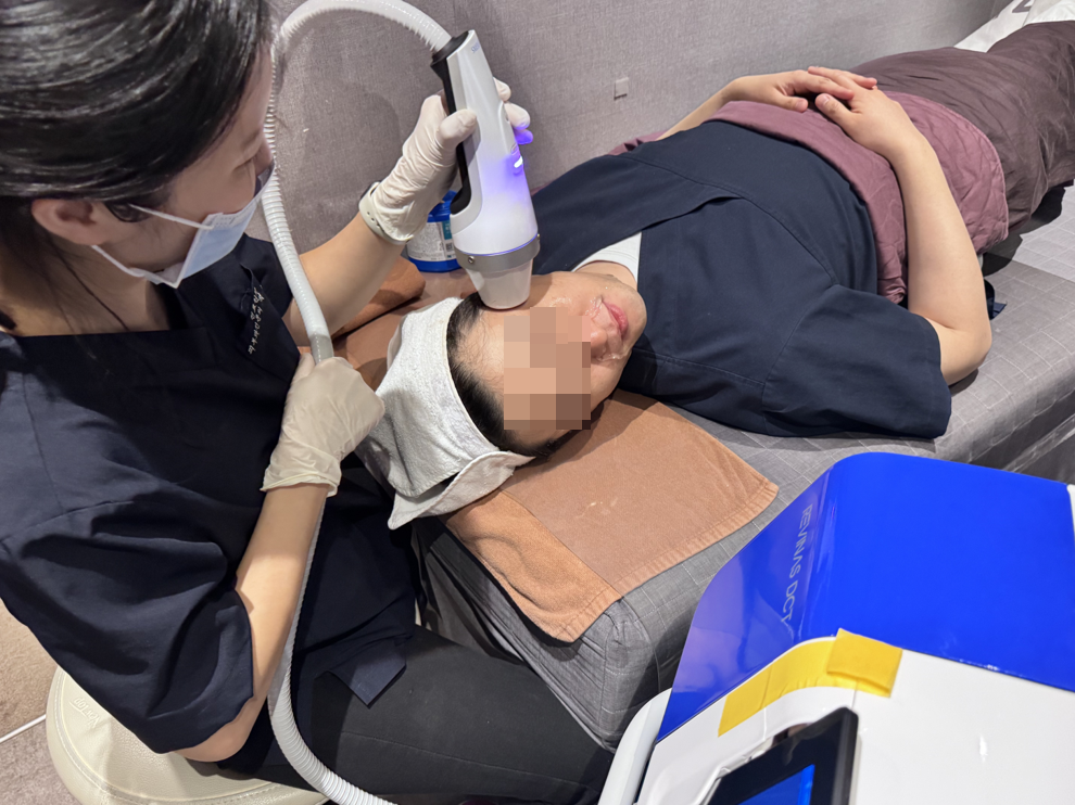 마취크림은 바르지 않고, 얼굴과 목에 겔을 바릅니다. 얼굴, 목선에 따라 에너지, 주파수를 맞춰 충격파 치료를 시작합니다.