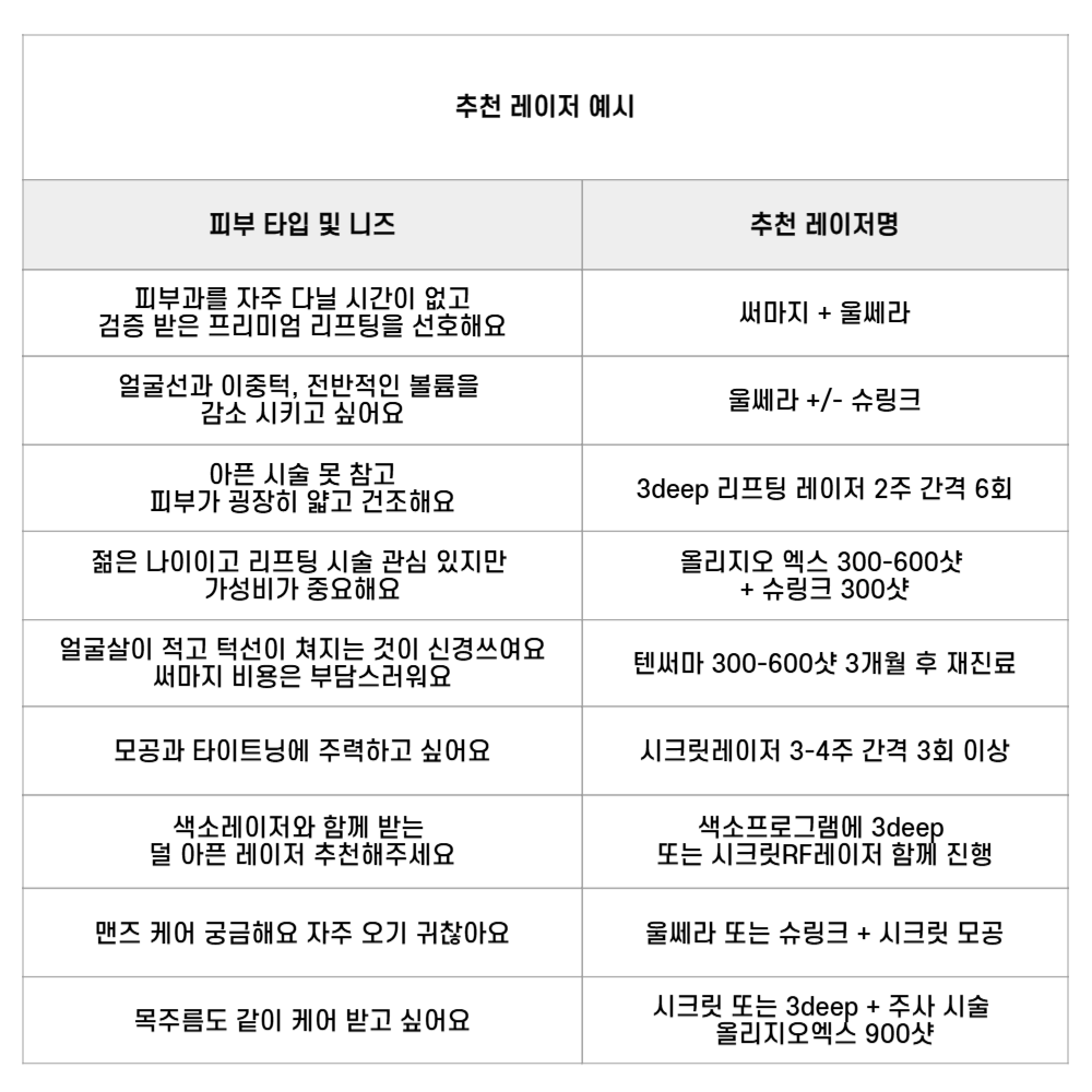 오체안에서는 개개인의 특성에 맞는 리프팅을 위해 다양한 기계를 도입 중에 있으며, 퍼스널 컬러를 찾아드리 듯 피부에 맞춘 레이저도 매칭해드리고자 본원에 있는 기계 라인업을 소개합니다.