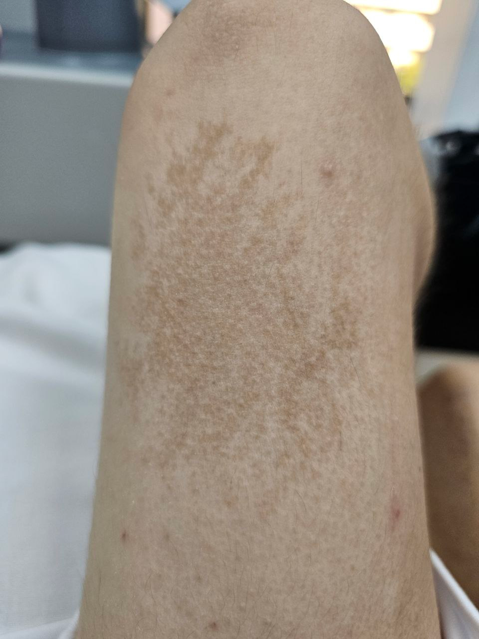 안녕하세요, 오늘은 팔에 색소 모반 치료 경과에 대해 말씀드리고자 합니다. 30대 초반 남성 환자분은 올해 4월초 내원하셨습니다. 사춘기 이후 팔에 발견된 모반 진료로 오신거였고, 10-20대에는 모발도 함께 존재했다고 하여, 베이커씨모반으로 임상적 진단하였습니다.