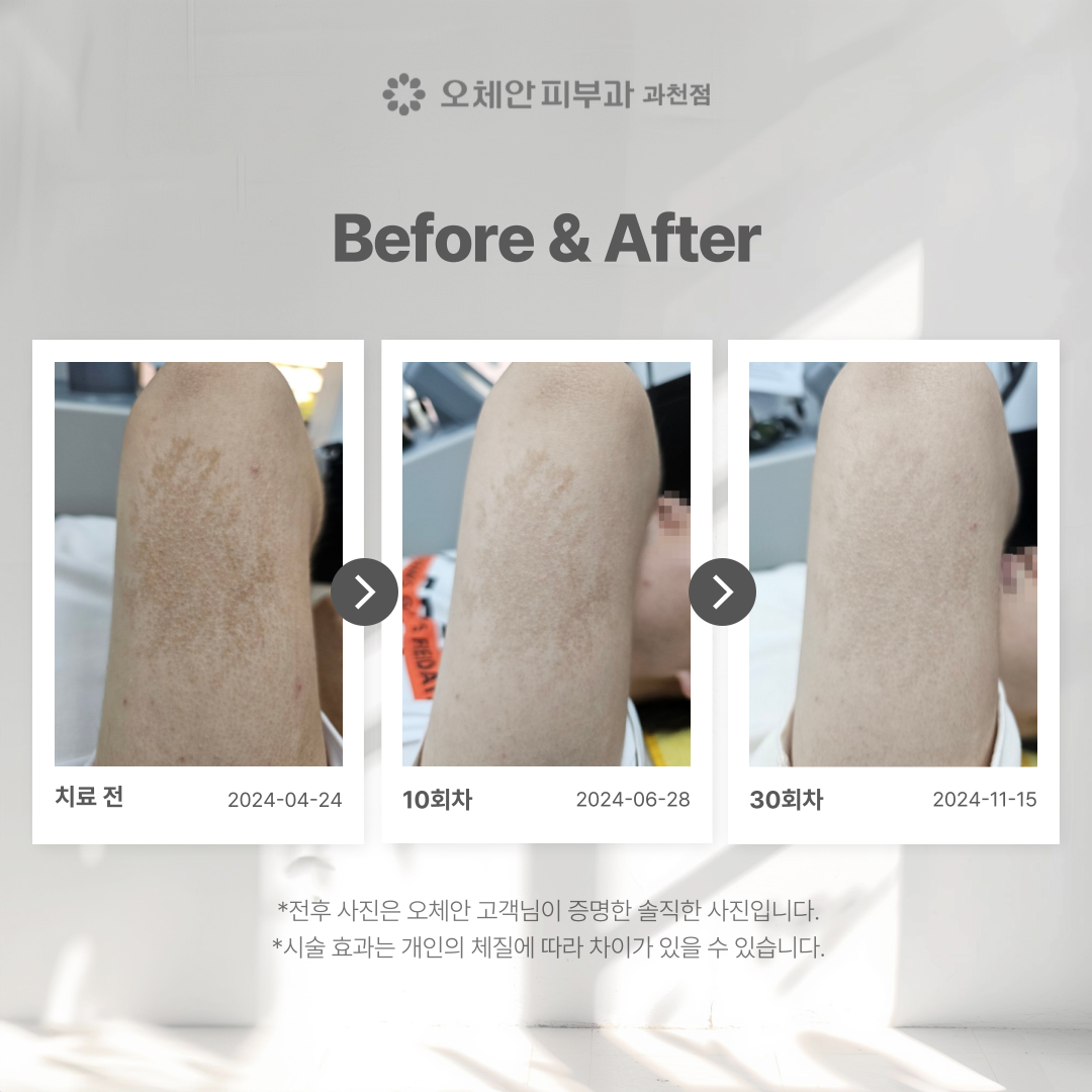 7-8회차까지는 색소 감소가 보이지 않았으며, 그 이후 차츰차츰 흐려지기 시작하였습니다. 30회 치료 세션을 마친 이후 환자의 만족도, 치료 효과 등을 고려하였을 때, 추가 치료가 의미 있는 것으로 판단하여 잔존색소에 대해 2-3주 간격으로 10회씩 더 치료를 받기로 하였습니다.